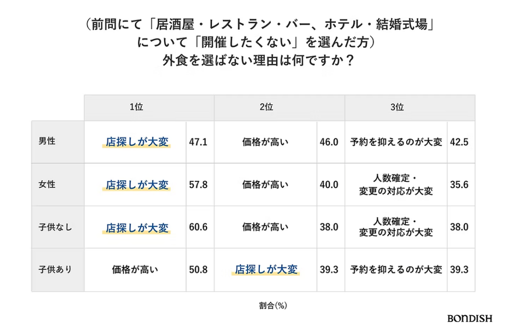 ボンディッシュが実施したアンケート調査では、懇親会における最大の悩みが「お店選び」であることが判明し、とくに40〜50代の“ベテラン幹事世代”で負担感が強く表れました(図1)。こうした背景から、移動・予約・会計などの手間を削減し、オフィスで完結するケータリングへの関心が高まっています。